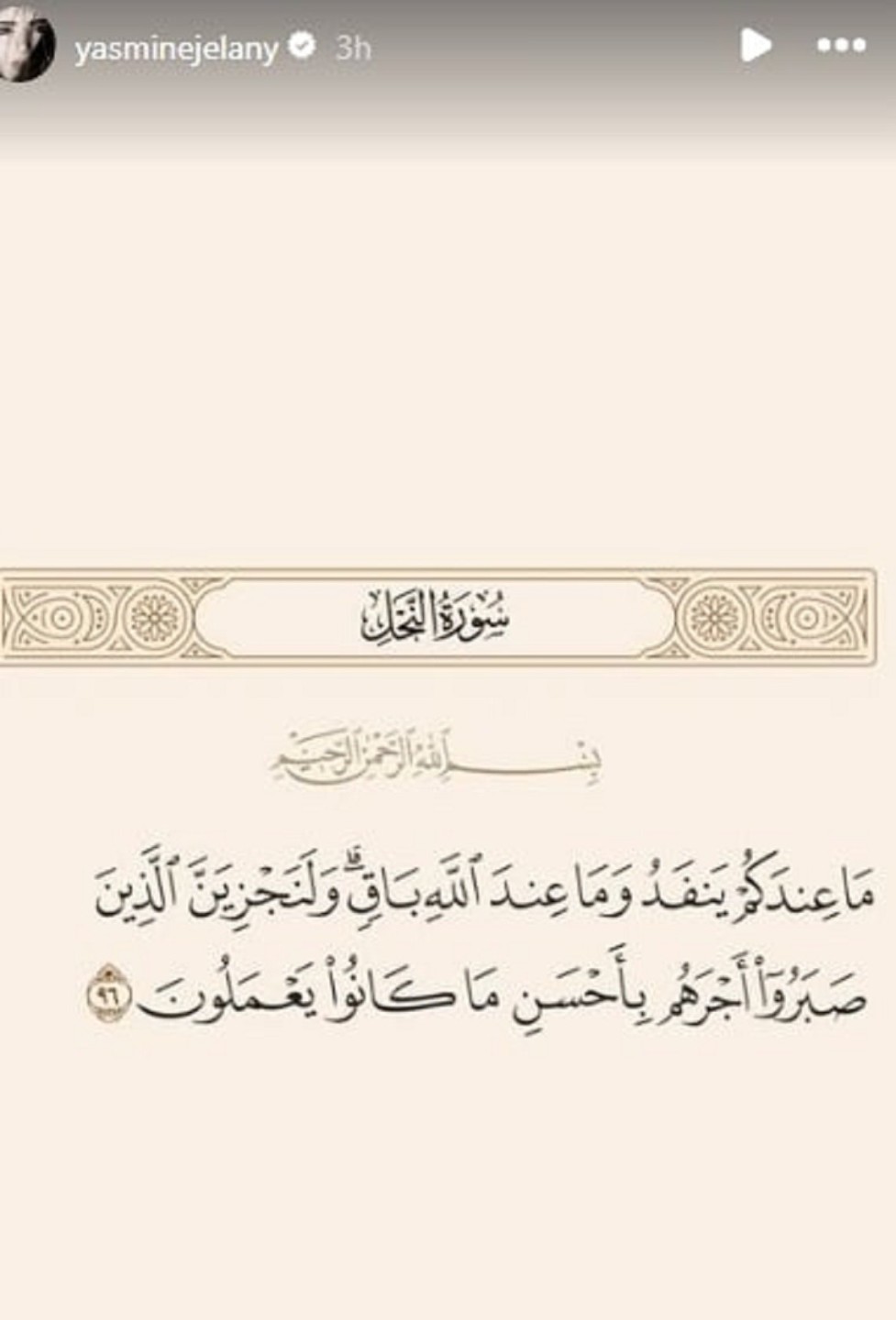 الآية التي اختارتها ياسمين تعكس معاني الصبر والرضا بقضاء الله، وتعد ردًا هادئًا وراقيًا على الجدل الذي أثارته أنباء الطلاق.